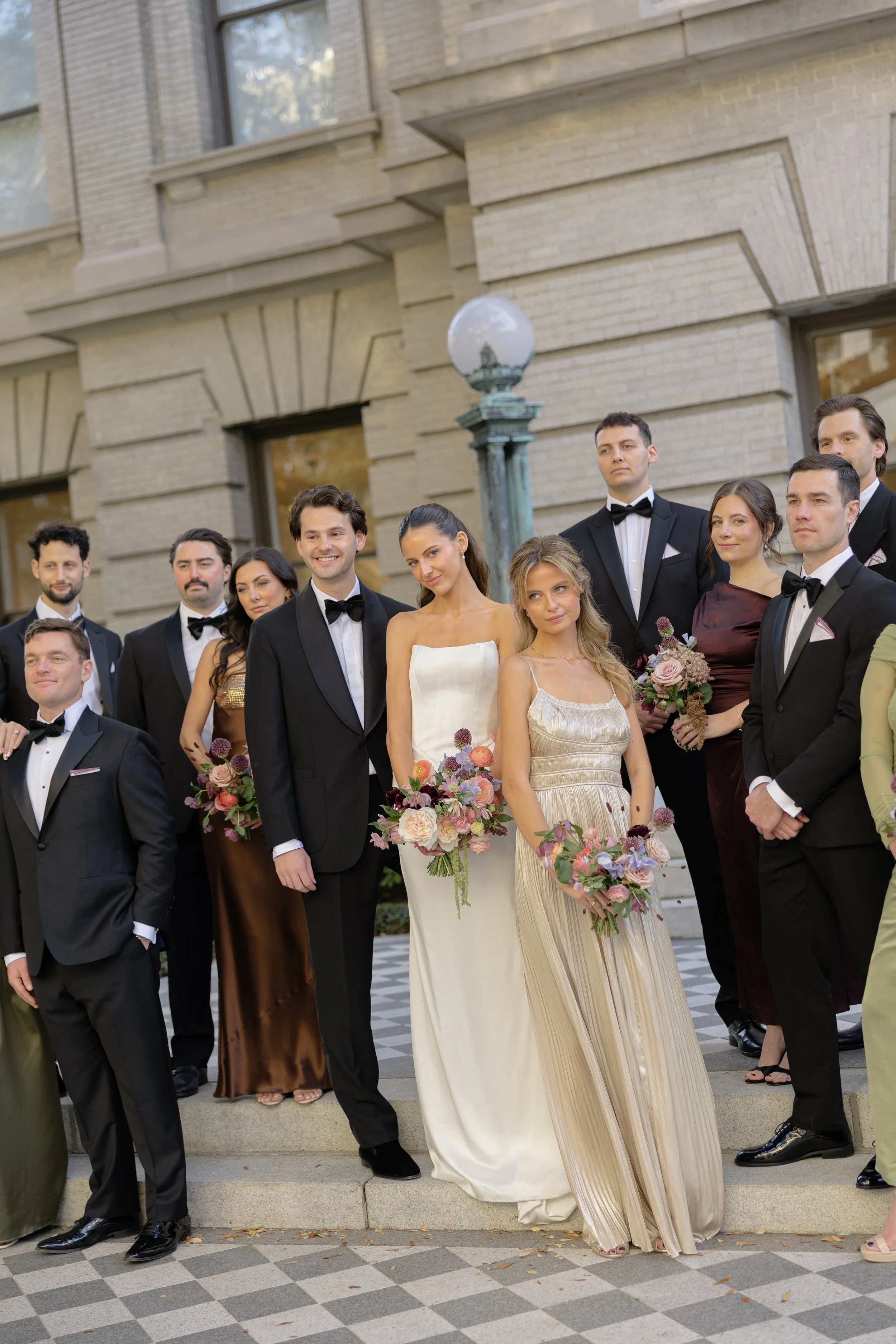 As twilight settled over the museum and the evening ceremony began, everything seemed to soften – the light, the air, the energy. Cocktail hour in the gardens felt like a dream. Guests wandering beneath market lights, champagne in hand, surrounded by autumn tones of burgundy, chartreuse, and peach that felt fresh and alive against the historic setting.